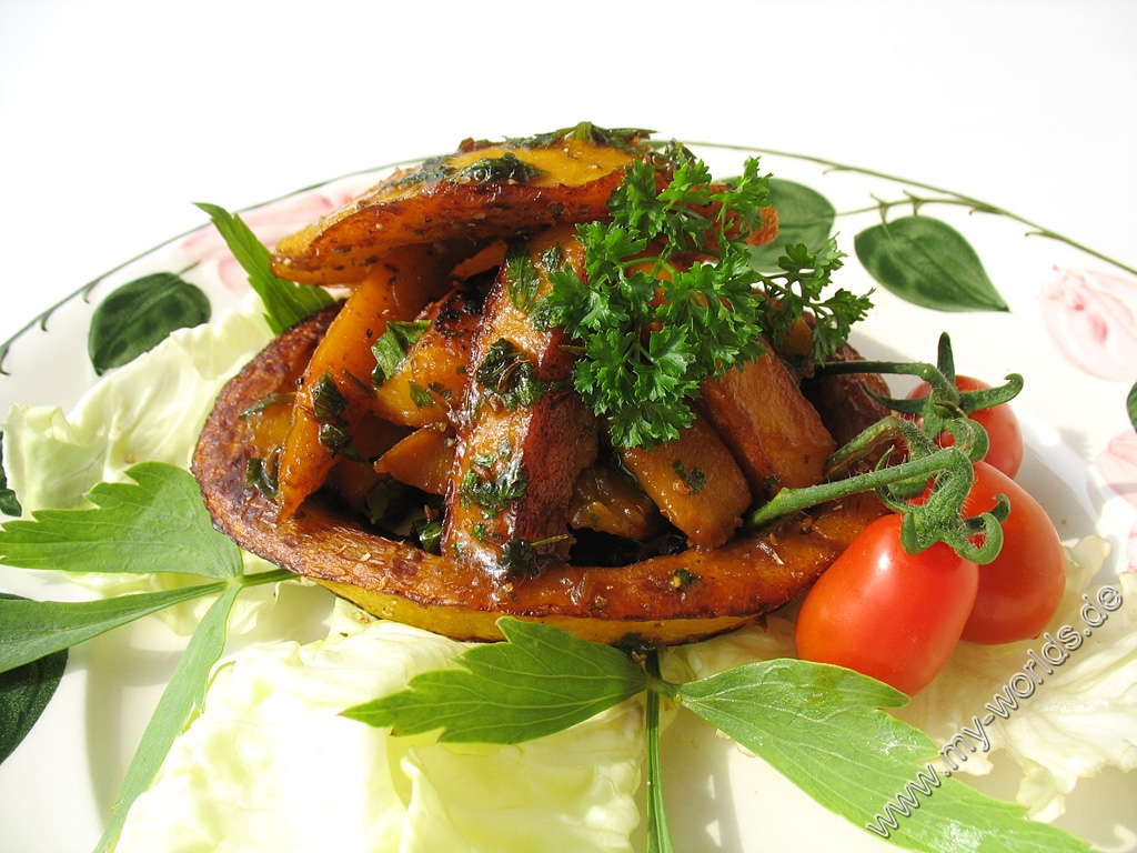 Превод: Подреди сварени и изпържени тикви в един тиган и сипи кимионов сос отгоре, след кати си ги полял със зехтин. Остави да заври и сервирай.